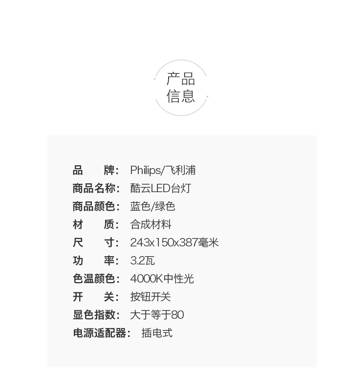 • 商品名称:Philips 飞利浦LED护眼学习阅读桌面台灯 酷云 蓝色/绿色(蓝色)