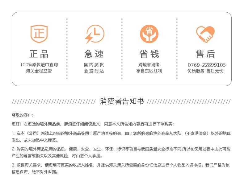 您好!为帮助您更好地选购境外商品,请您在购买前务必认真、详细阅读并完全理解本告知书的全部内容,并对自身风险承担做出客观判断。同意本告知书内容后再下单购买: