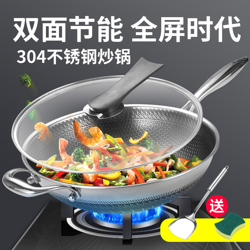 304双面全屏不锈钢炒锅 无油烟不粘锅 平底炒菜锅电磁炉通用锅具(银色)