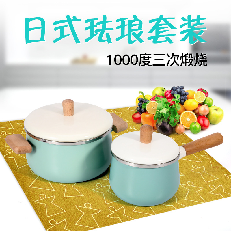 >  日式汤锅搪瓷小奶锅韩式汤锅宝宝辅食锅电磁炉通用礼品锅锅具套装(天蓝)