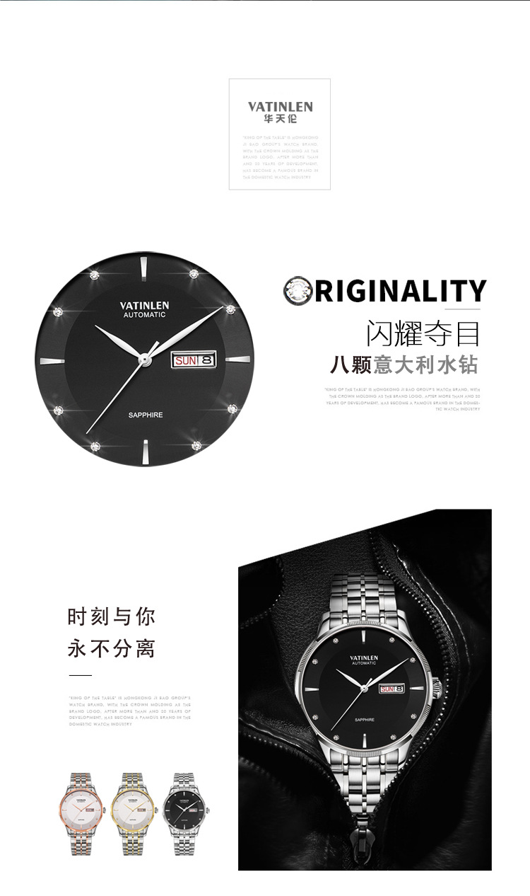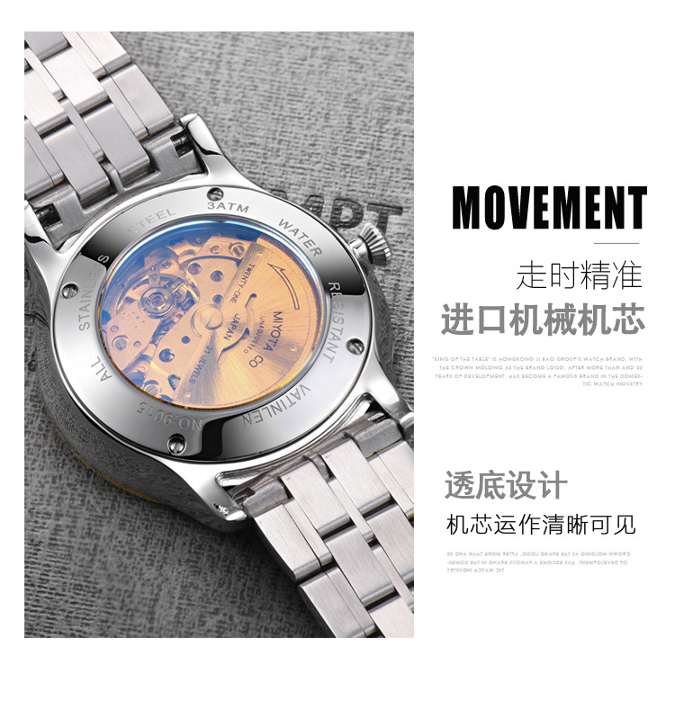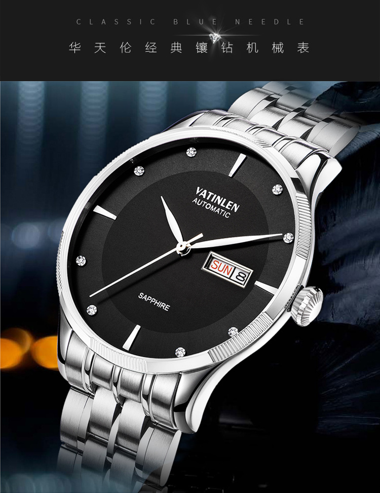 • 商品名称:正品瑞士商务防水表镶钻手表精钢带全自动机械男表韩版爆款(白色)