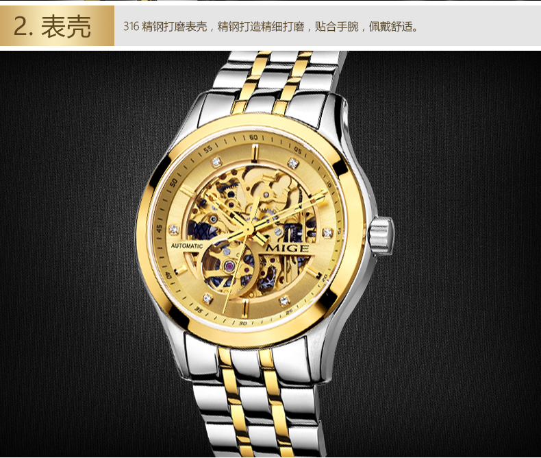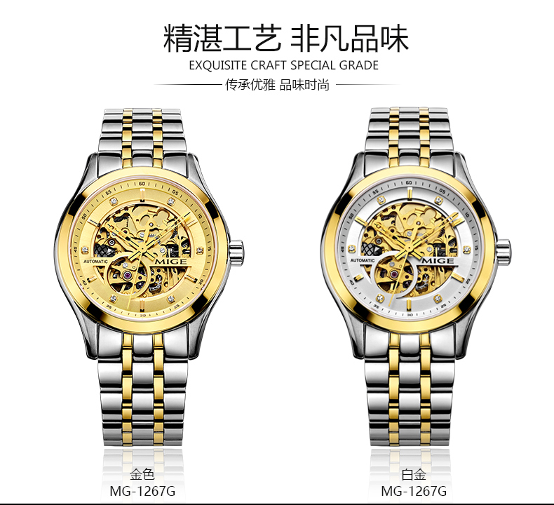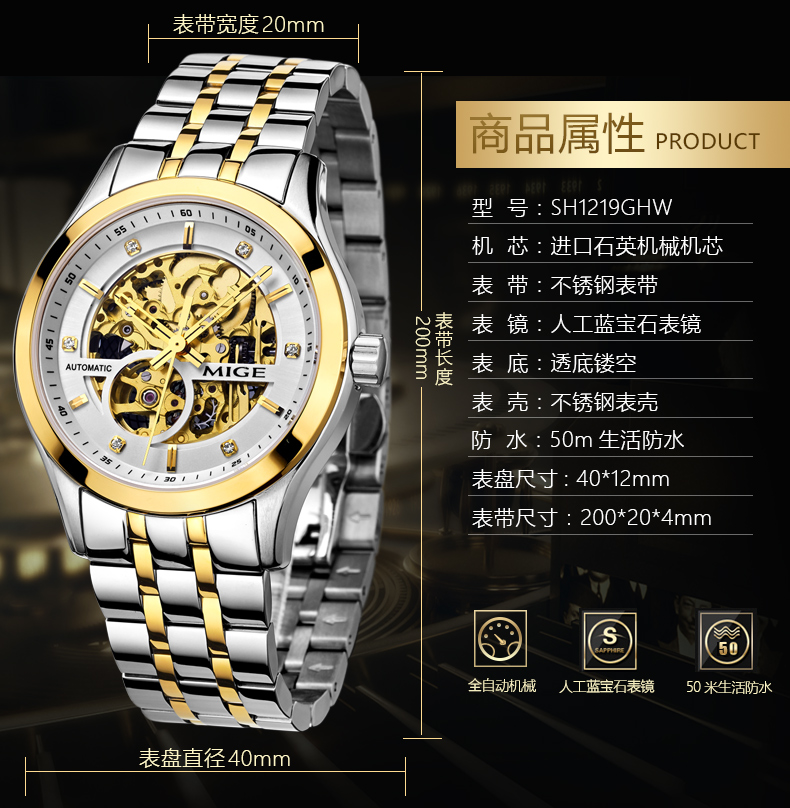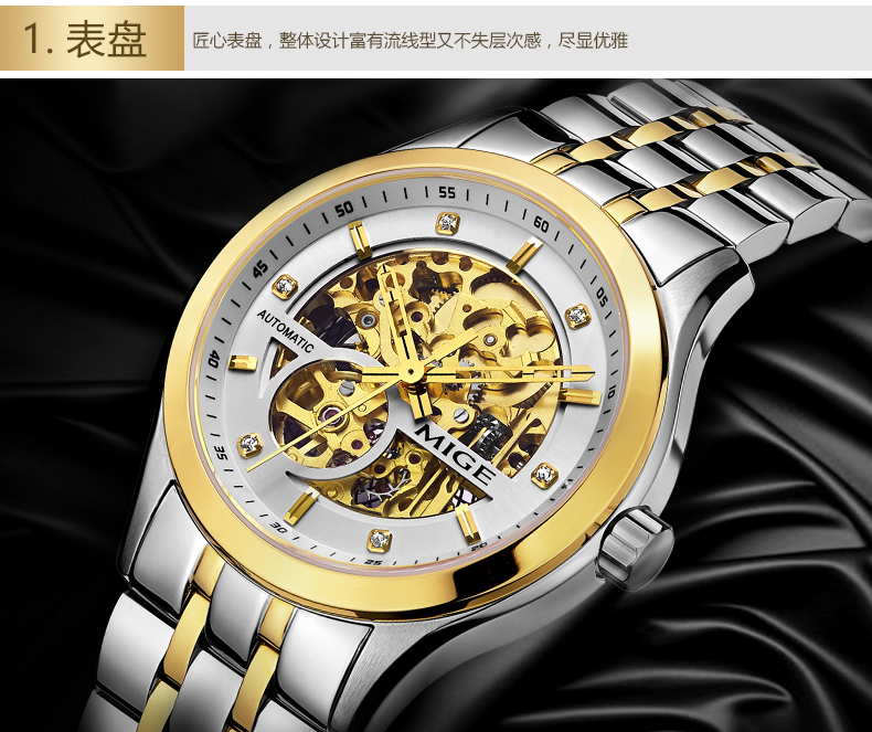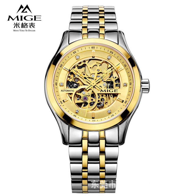 • 商品名称:MIGE米格镂空陀飞轮手表 男潮流精钢全自动机械表MG(黄色)