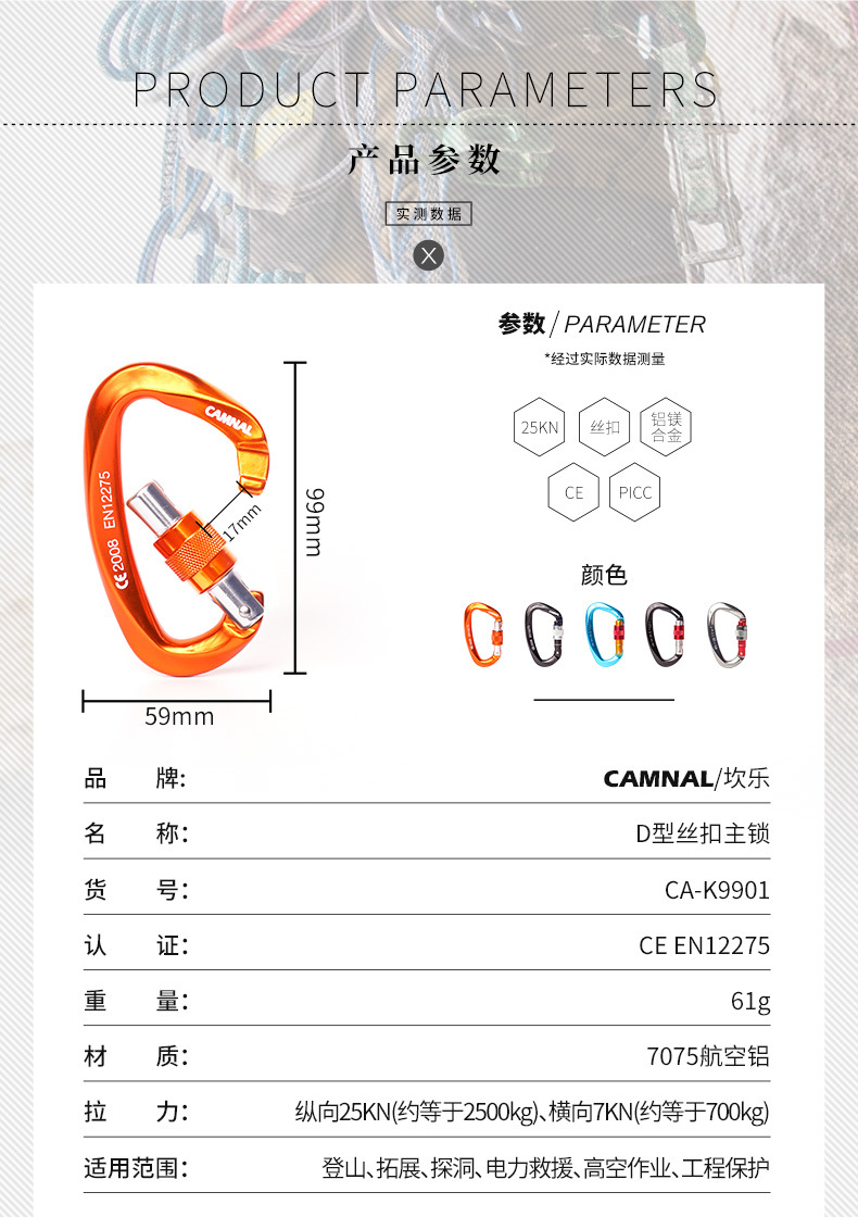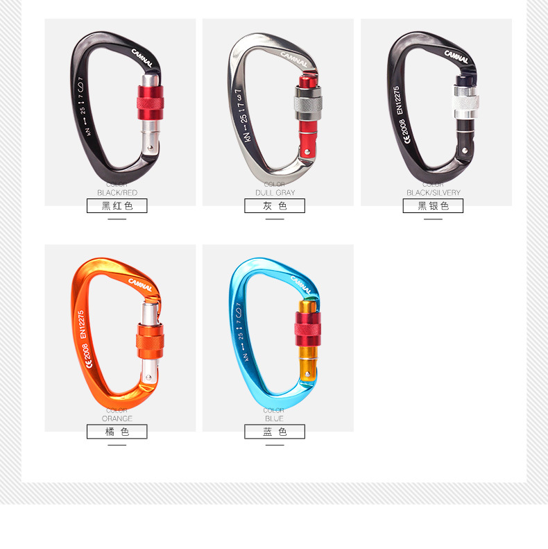 • 商品名称:坎乐 丝扣主锁 攀岩 主锁 户外装备丝扣锁攀岩用品安全扣25KN多色(拼色)