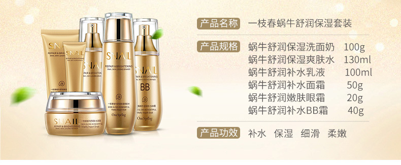 • 商品名称:一枝春蜗牛六件套舒润保湿 补水莹润面部春夏护肤套装化妆品(50g)